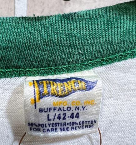 TRENCH社製コットン50%ポリエステル50%ボディでグリーンは染み込みプリント(黒はベタかもしれません)