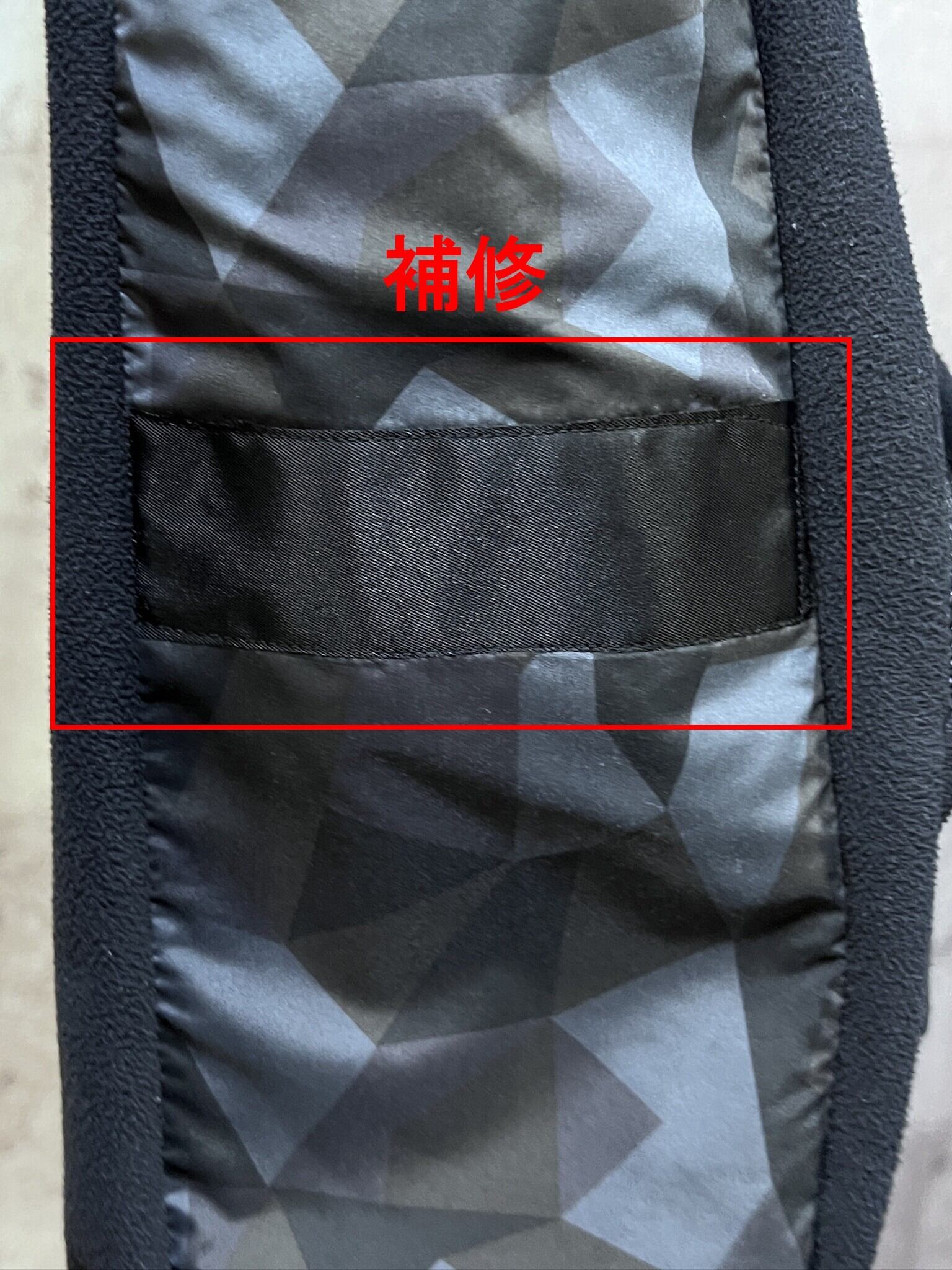 右脇腹に破れがあったので補修布を貼ってラインぽくミシンで縫ってあります。