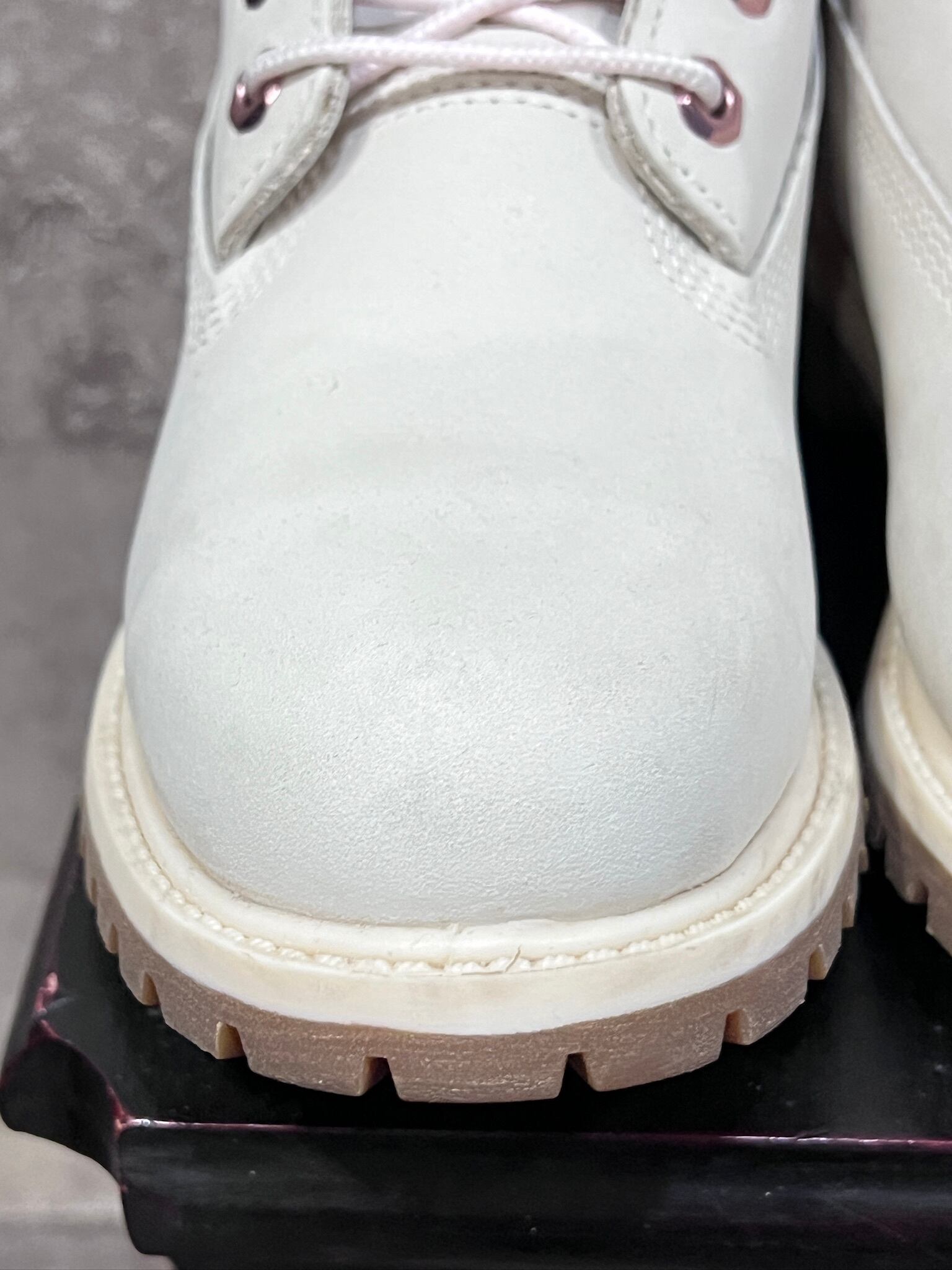 オフホワイトのヌバックにパールピンクのアンクルとアイレットがカワいいプレミアムブーツ
