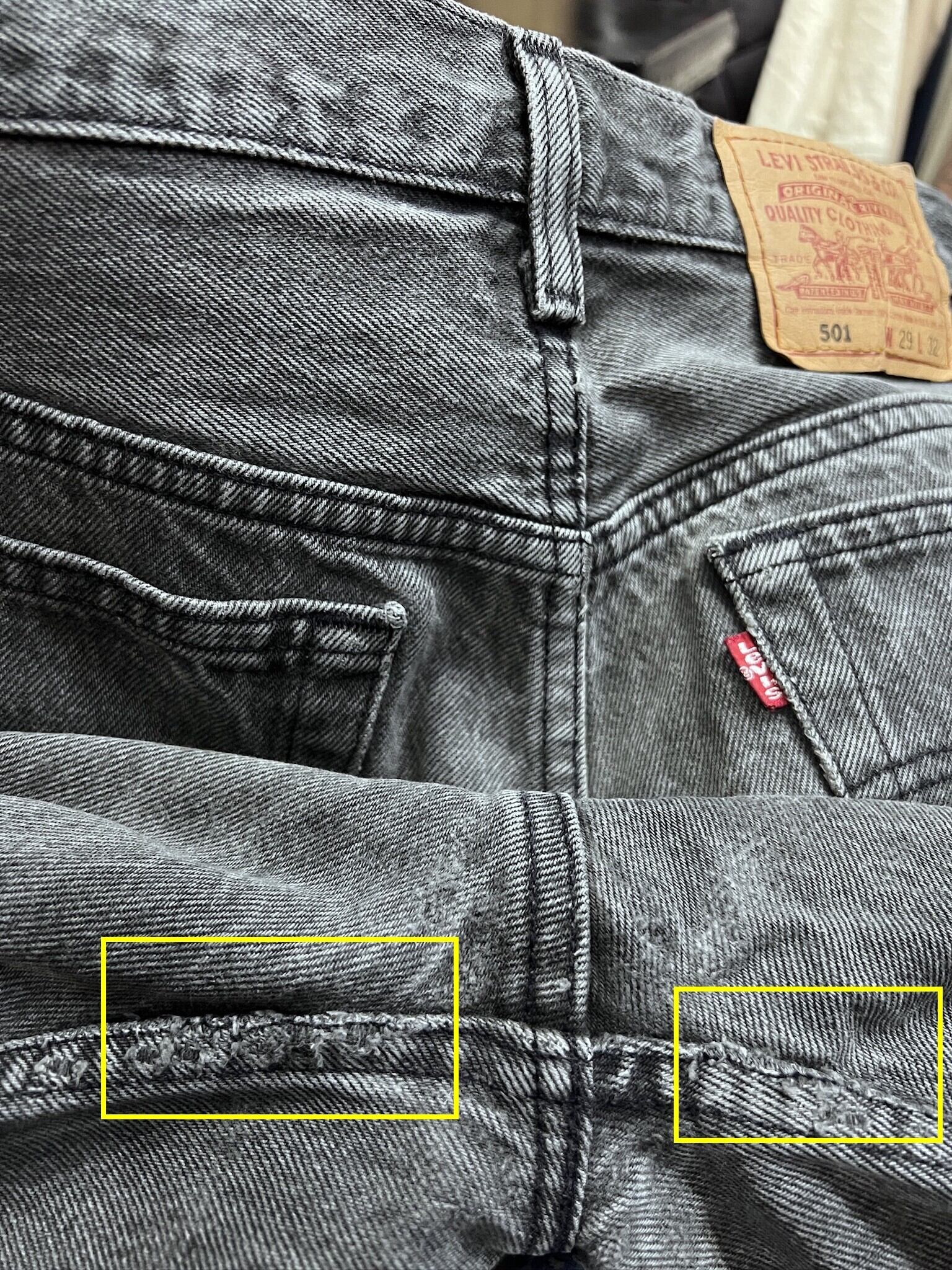 背面左裾上とウエストに解れあり、股下は若干の擦れぐらいです
