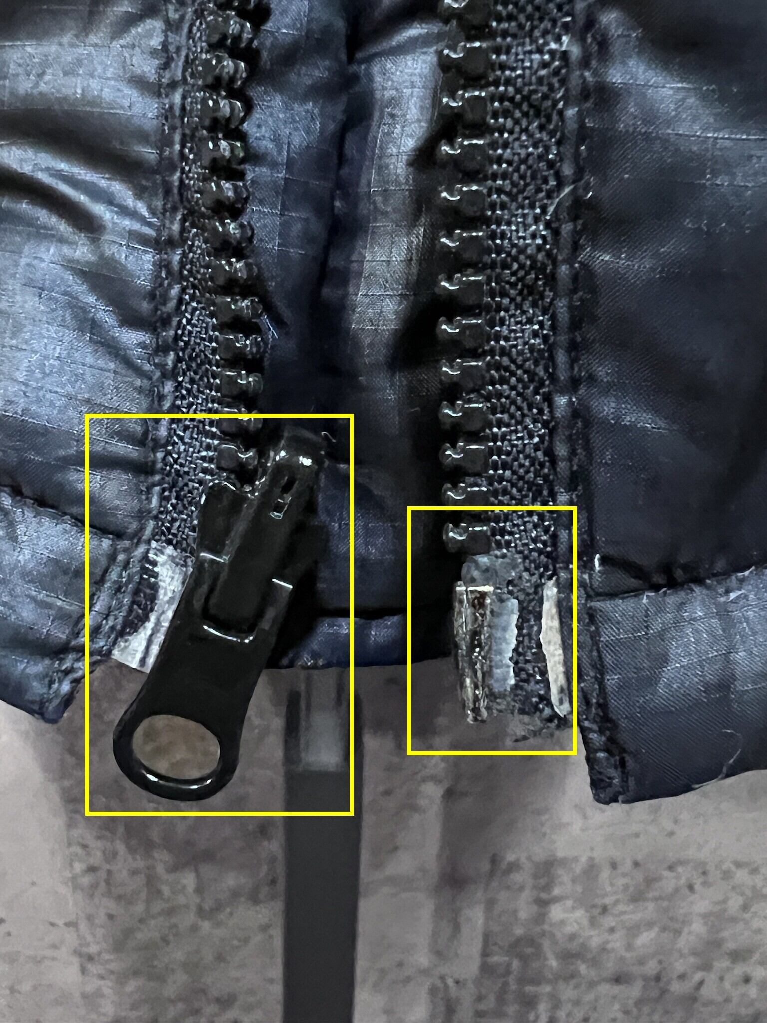 ●フロントジッパーのスライダーが壊れて使えなかったのと、一番下の挿し込みパーツが取れてありませんでした。ジップのコマも1つ取れているかもしれません。)