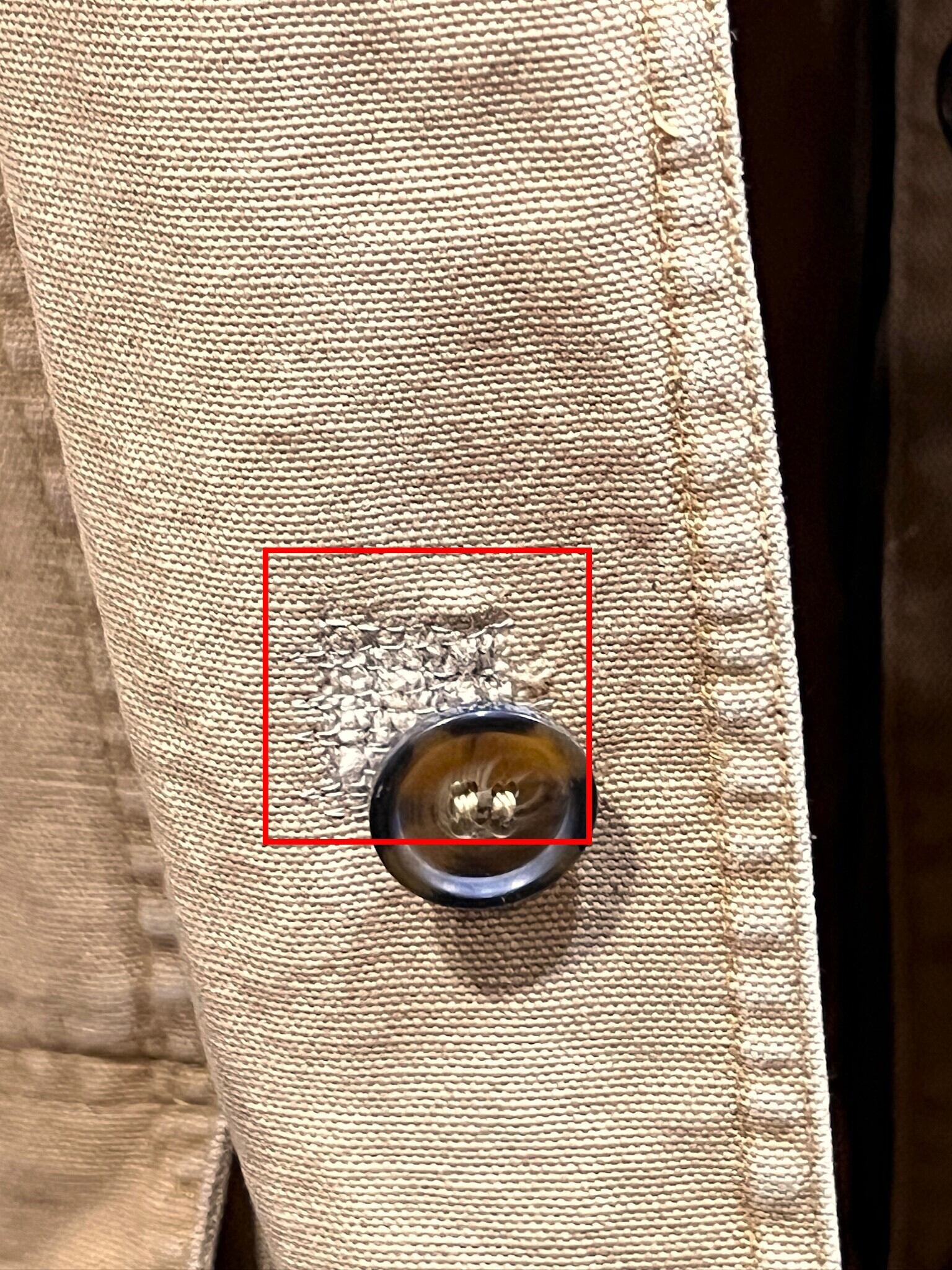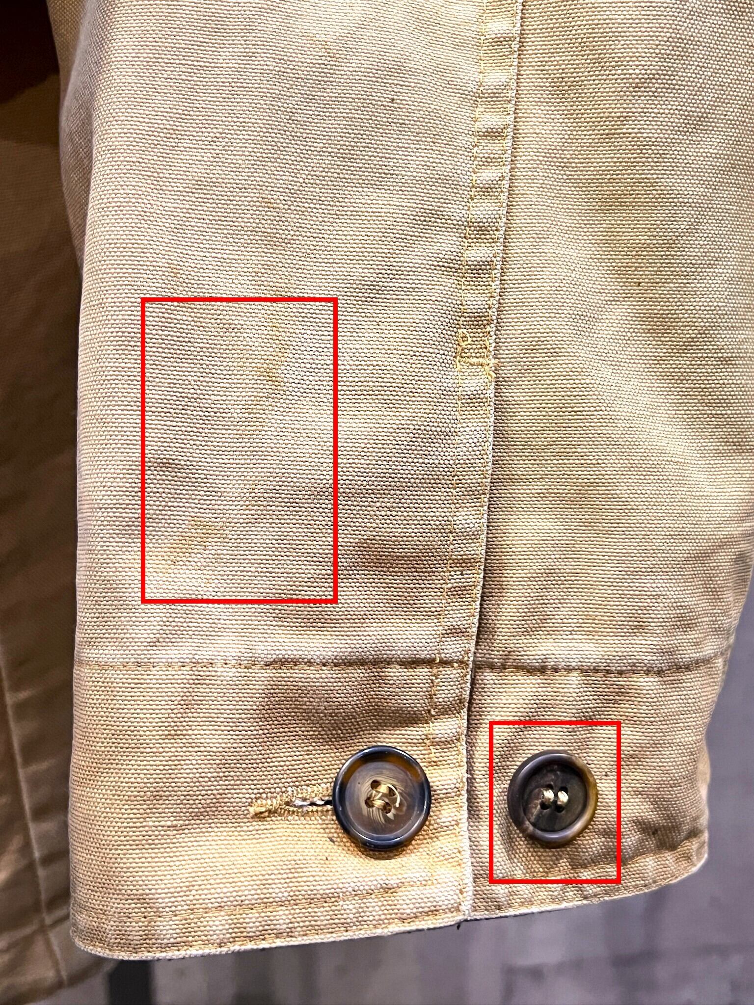 フロントボタンが1つ欠品で、1つ割れていたので、片側2つある袖ボタンを左右から1つづつ移植し、袖には似た感じのボタンを付けました。