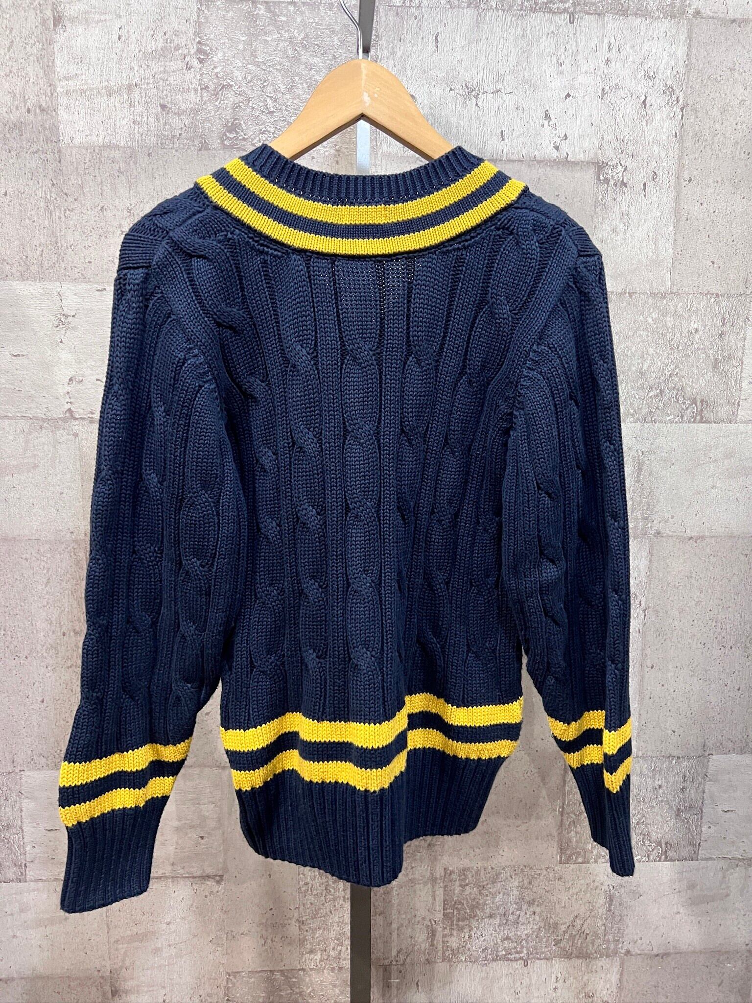 コットンのケーブル編みのチルデンニットで、トラッドにもカジュアルにも使える使えます