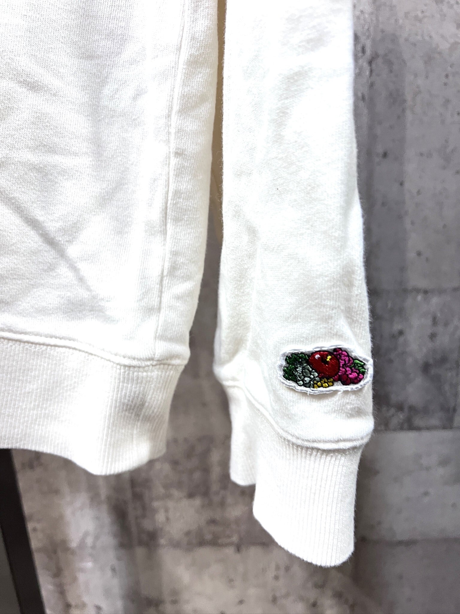 こちらはフルーツがカワいい印象的なタグのデザインをバックにプリントしたクルースウェット