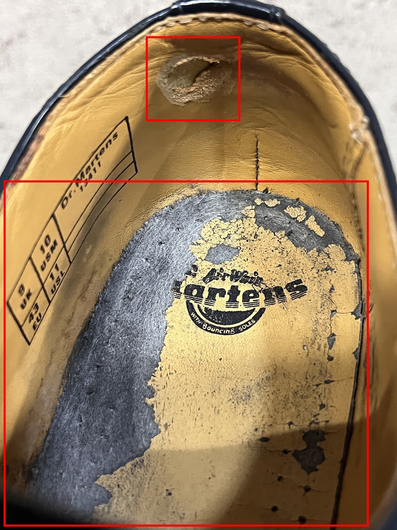 履いた際に剥げが靴下に付かないようにと、脱いだ際に少し汚く見えてしまうので、新品の中敷きを入れておきます。