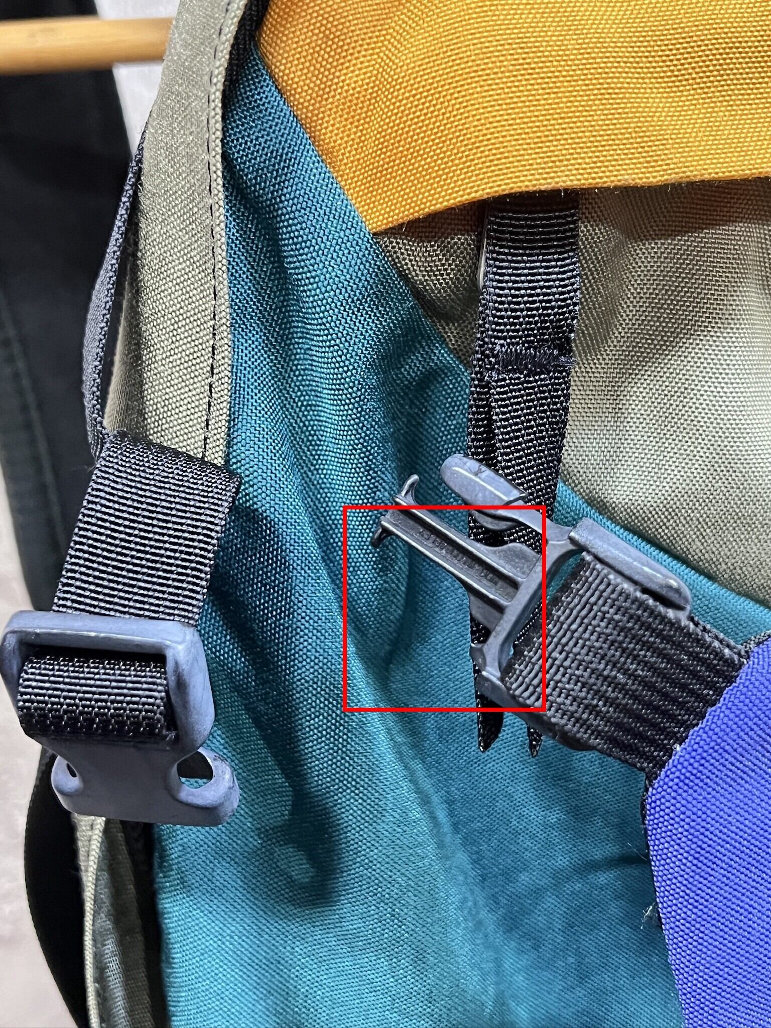 左上のバックルの片ヅメが折れていますが、バックルはちゃんと留まります。