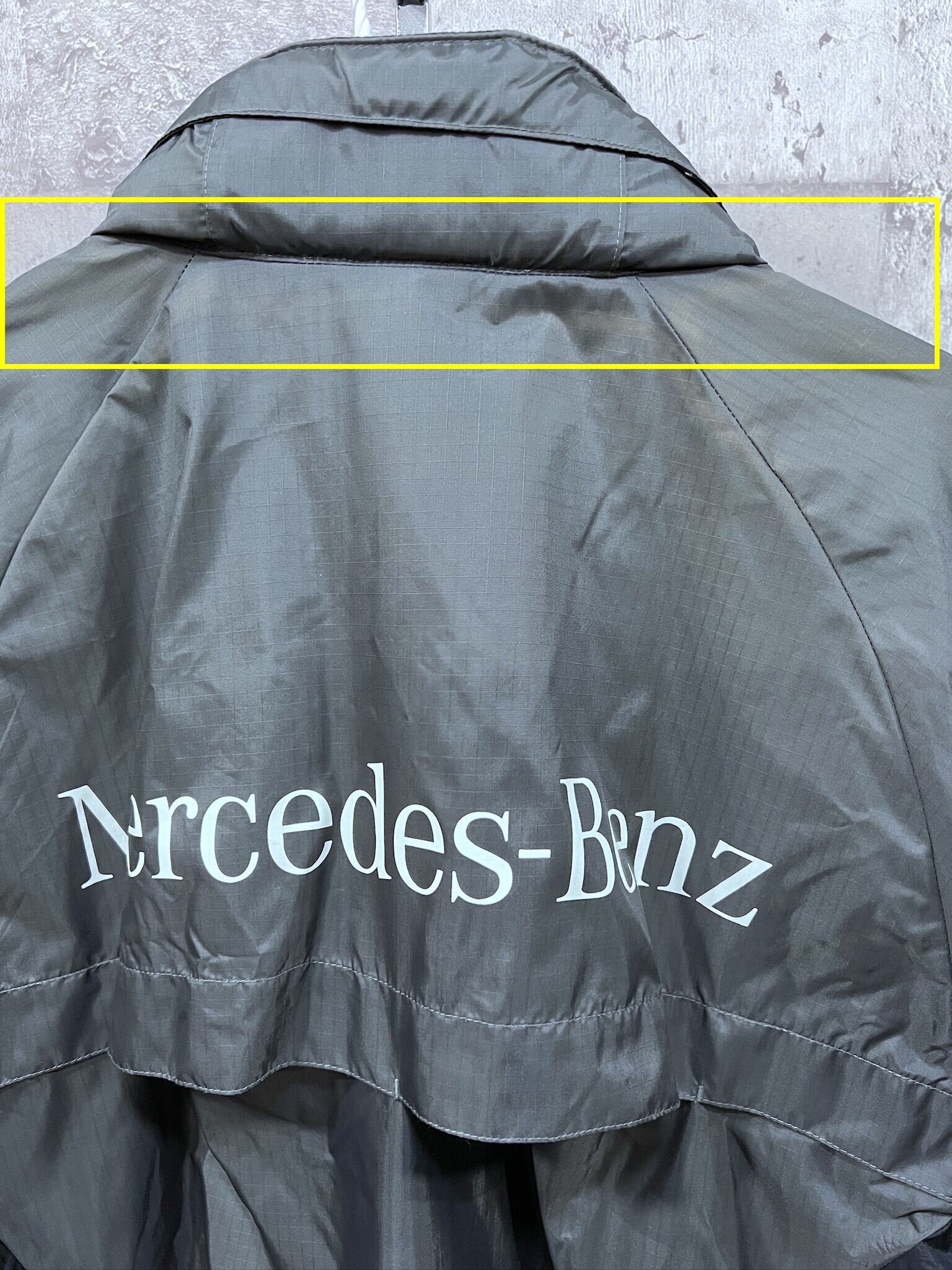 襟周りや肩に変色あり、ボディより襟の中のフードのほうが色が濃いので、全体的にも多少変色があるようです。